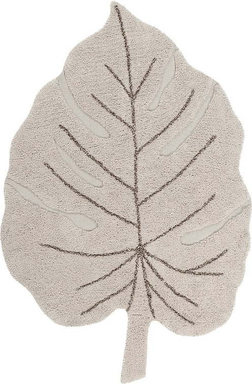 Tento měkký pratelný koberec značky Lorena Canals ve tvaru listu monstery kombinuje jemný bavlněný vlas s detaily viditelného plátěného základu v přírodní barvě.