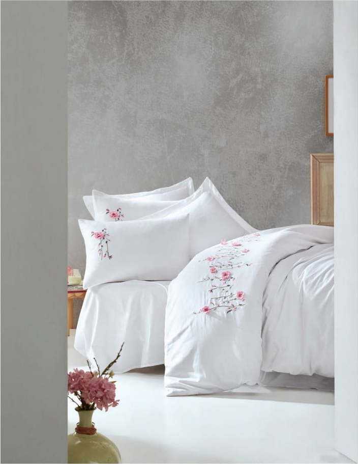 Další informace k produktu: Bílé povlečení z bavlněného saténu s prostěradlem na dvoulůžko Perla White, 200 x 220 cm